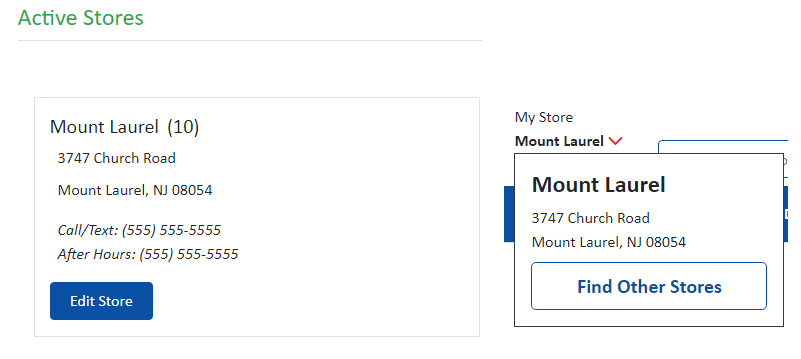 Create physical stores from your P21 locations and assign shoppers to their local stores to enable pickup options. Shoppers have optional ability to see available across other stores, and also change their default store.